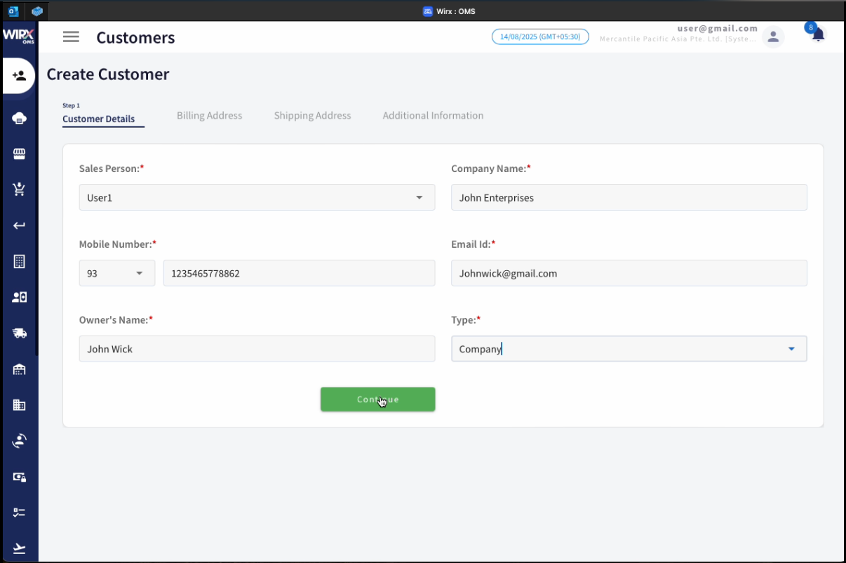 The Create Customer feature in WIRX OMS allows users to add new customers to the system by entering their details through a guided, multi-step form. This process ensures that all relevant customer information is captured for operational, sales, and compliance purposes.